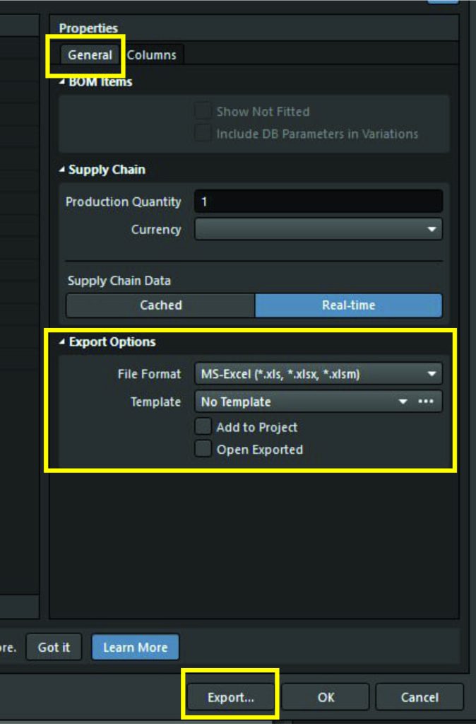 بعد از تنظیم لیست به صورت مطلوب، می توان آن را پرینت گرفت یا به صورت فایلی با فرمت مشخص (csv ,*.pdf ,*.xls.* و ….) ذخیره نمود. برای این کار در سمت راست پایین لیست در بخش Export Options، فرمت فایل را انتخاب و در صورتی که میخواهید خروجی در محل ذخیره شدن پروژه قرار بگیرد Add to Project را فعال کنید. با فعال کردن گزینه Open Exported نیز فایل خروجی بعد از ایجاد، باز شده و نمایش داده خواهد شد.